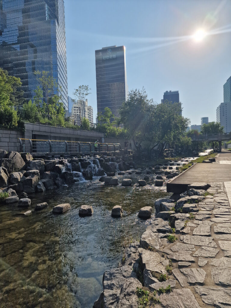 En sortant, ressource-toi en longeant le Cheonggyecheon Stream. Ce ruisseau artificiel traverse le centre de Séoul, mais une fois à ses abords, tout devient calme. Bruit de l’eau, petites cascades, bancs ombragés… c’est une vraie parenthèse zen en pleine ville.