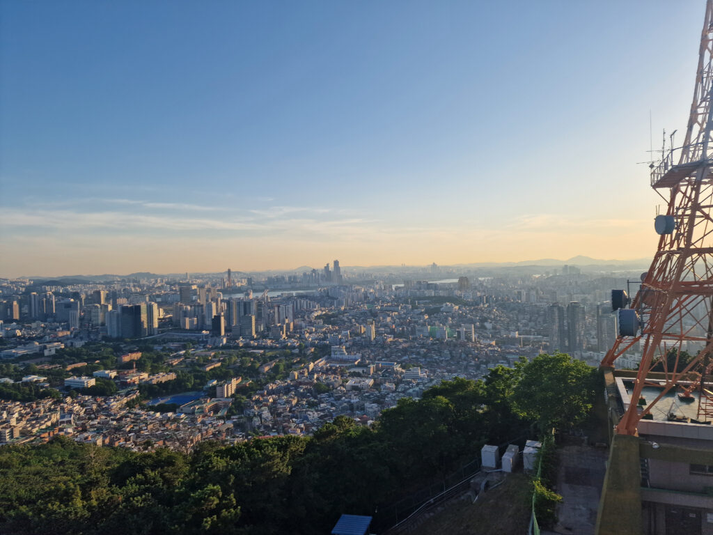 Pour clore cette belle journée, prends doucement de la hauteur : direction la Namsan Tower. Tu peux grimper à pied (compte une bonne trentaine de minutes avec quelques pauses photo) ou opte pour le téléphérique si tes jambes réclament un peu de repos.