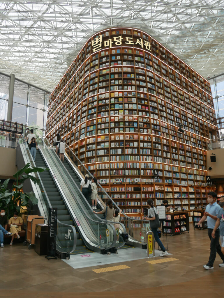 Traverse ensuite la rue pour explorer le COEX Mall, immense centre commercial souterrain. Même si tu n’es pas d’humeur shopping, la bibliothèque Starfield vaut le détour : des murs de livres vertigineux, une lumière douce… l’endroit donne envie de s’installer avec un roman (ou de faire quelques photos, on ne va pas se mentir).